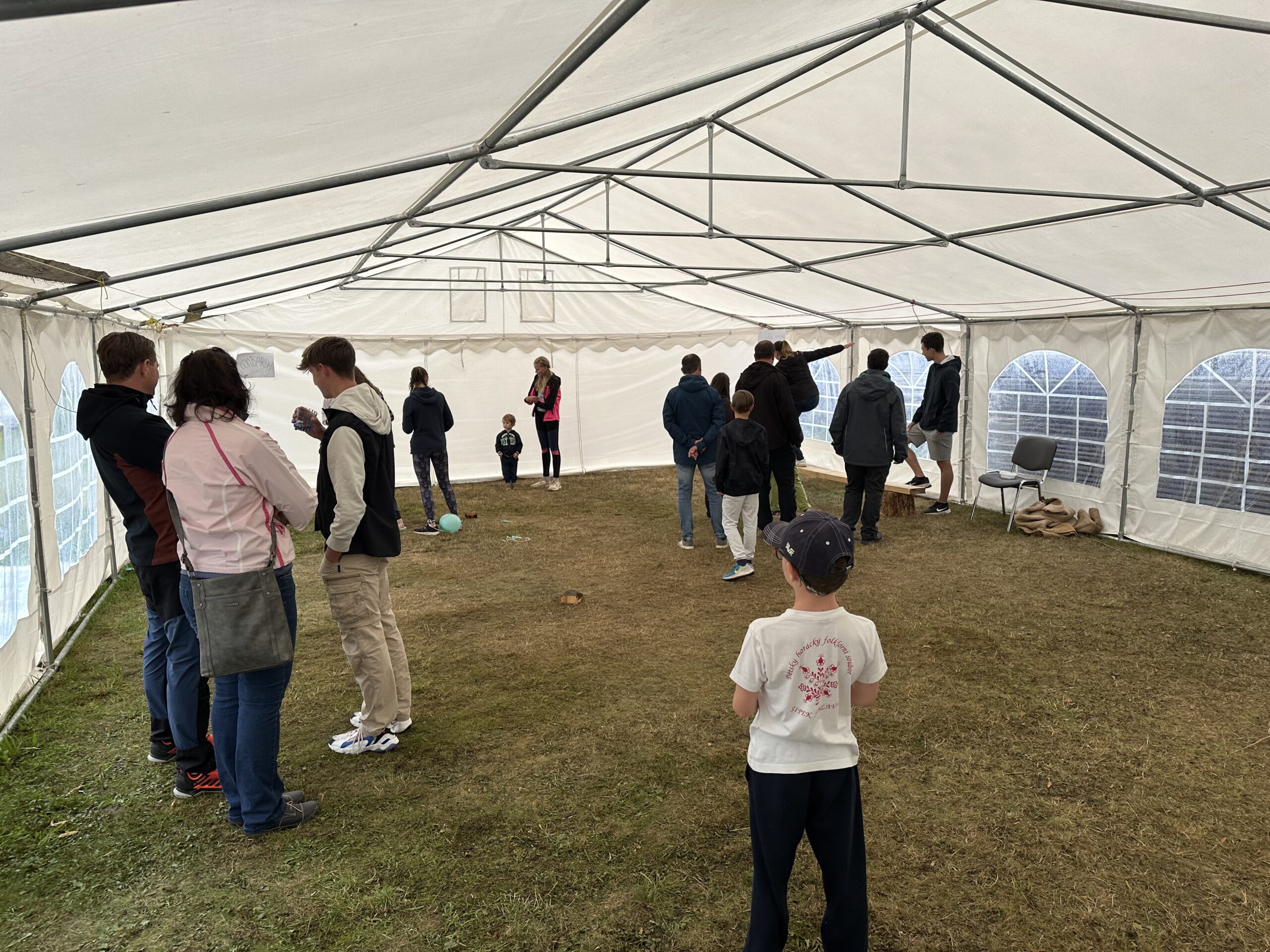 Pak už přišlo to, na co jsme se už dlouho těšili. Byl dnes totiž návštěvní den a po obědě nás přijeli navštívit rodiče, a tedy rozhodně nepřijeli s prázdnou! Přivezli nám výborné buchty a šneky a koláče a ovoce a fůru dalších laskominek. Byla to taková nádhera – úplný ohňostroj chutí! Mimo jiné měli pro nás vedoucí a pár jedinců z řad účastníků připravené soutěže – přijela pouť. K našemu překvapení dokonce i přestalo pršet, takže jsme mohli využít celou zahradu a nemuseli jsme se mačkat pouze ve stanu. Mohli jsme zde navštívit například chůzi po kladině, práskání bičem, střílení z praku, kimovku, šifry schované v uzlíkách nebo třeba hod holínkou a spoustu dalších. Za každou disciplínu jsme dostali odměnu – táborové korunky, za které jsme si mohli v našem vytvořeném obchůdku s kouzelným názvem „Medový ráj“, zakoupit různé zajímavé předměty. Třeba kachničku ze slámy, klíčenky, omalovánky, DVD o zemědělství, bonbonky nebo sušenky. Novinkou na naší pouti byl fotokoutek s různými rekvizitami a vtipně nadepsanými bublinami. Do soutěží se již tradičně nezapojily pouze děti, ale s velkou chutí se zapojili i rodiče a sourozenci, z čehož máme velikou radost. Když jsme se všichni dostatečně poveselili, přišlo na řadu loučení.