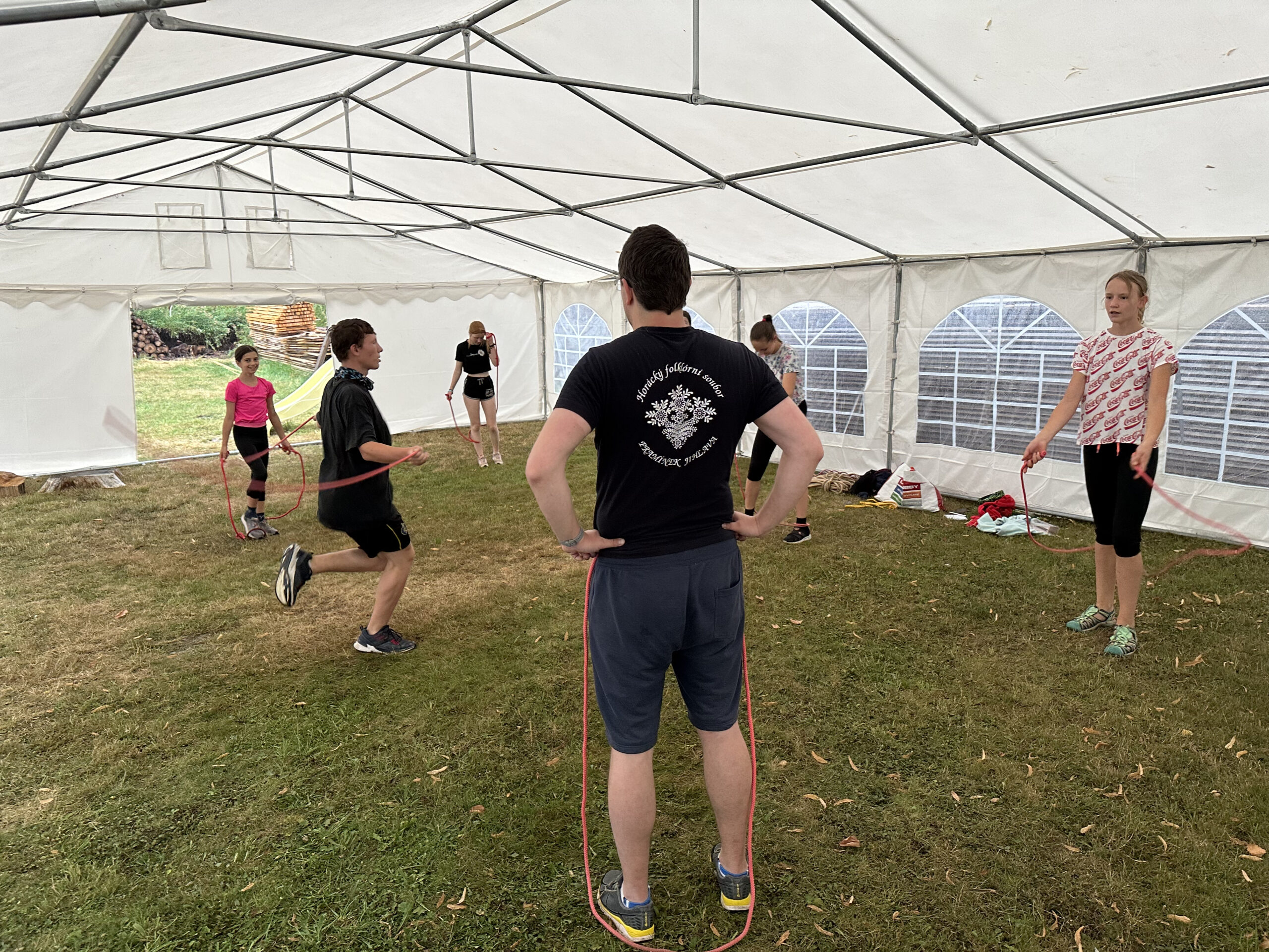 Vstávání do prvního pracovního dne nám sice dnes ráno nezpříjemnilo sluníčko, ale teplé počasí bylo příjemné. Rozcvičku pro první až třetí družstvo si vzali na starost Zbýša, Worši a Verča, čtvrté a páté družstvo po ránu protáhla LePra a pan Brtník, ke kterým se (i přes LePřino vzdorování) přicmrndli táborníci Ráďa a Vašek.