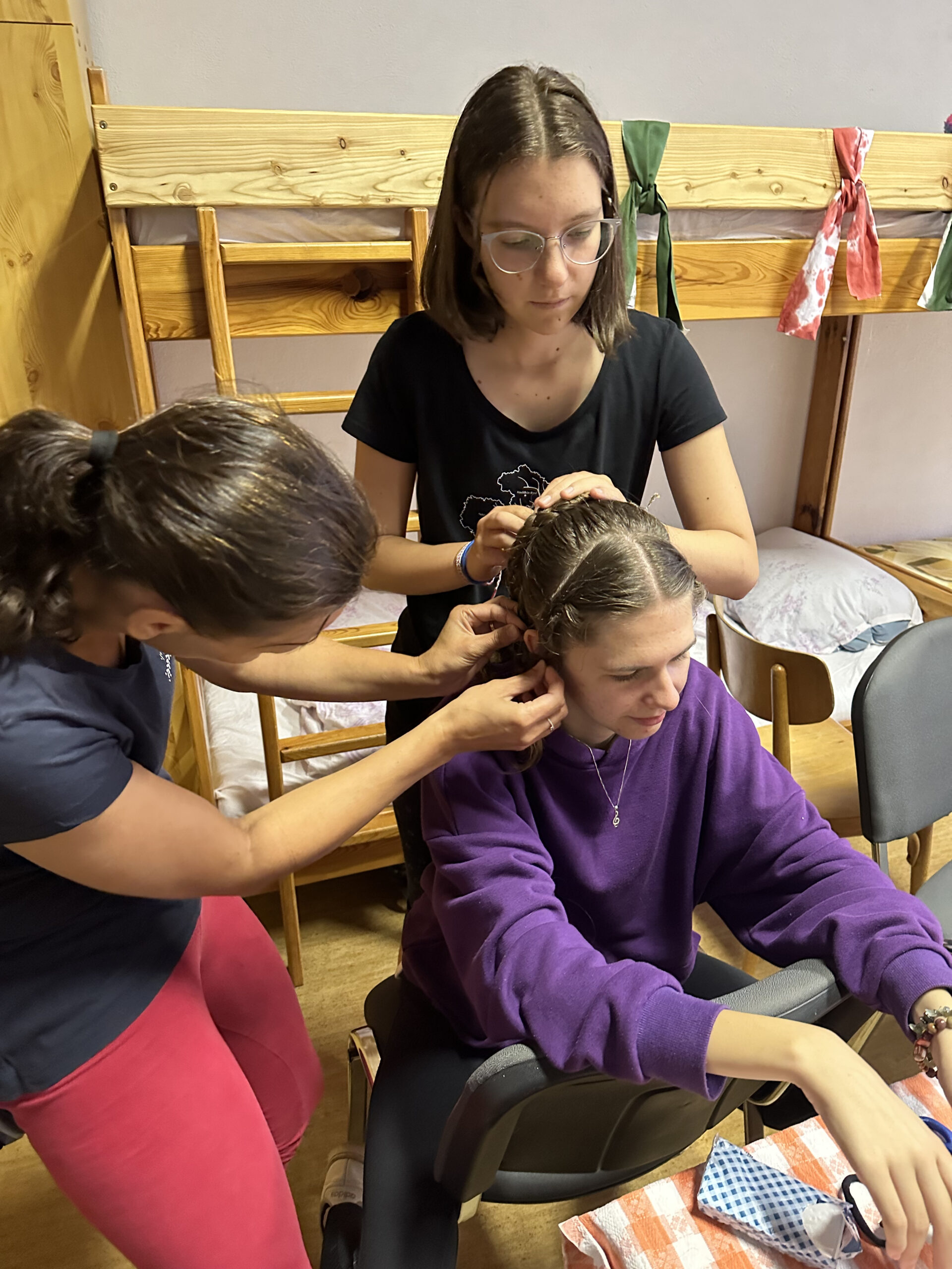 Lahodné pečené kuře s rýží, které si hladové děti (i vedoucí) odnášeli na talíři ke stolům, dodalo sílu na následné ruční práce a nácviky na vystoupení. Ručních prací máme letos na výběr opravdu spoustu, táborníci se odvážně chopili pletení šály na rámu, drátkování, háčkování nebo vyšívání. Nejmenší se, již tradičně, ujali stavby hmatového chodníčku. Detaily z nácviků nebudeme prozrazovat dopředu s nadějí, že Vás, naše milé čtenáře a diváky, uvidíme a snad i překvapíme na vystoupení na konci tábora.