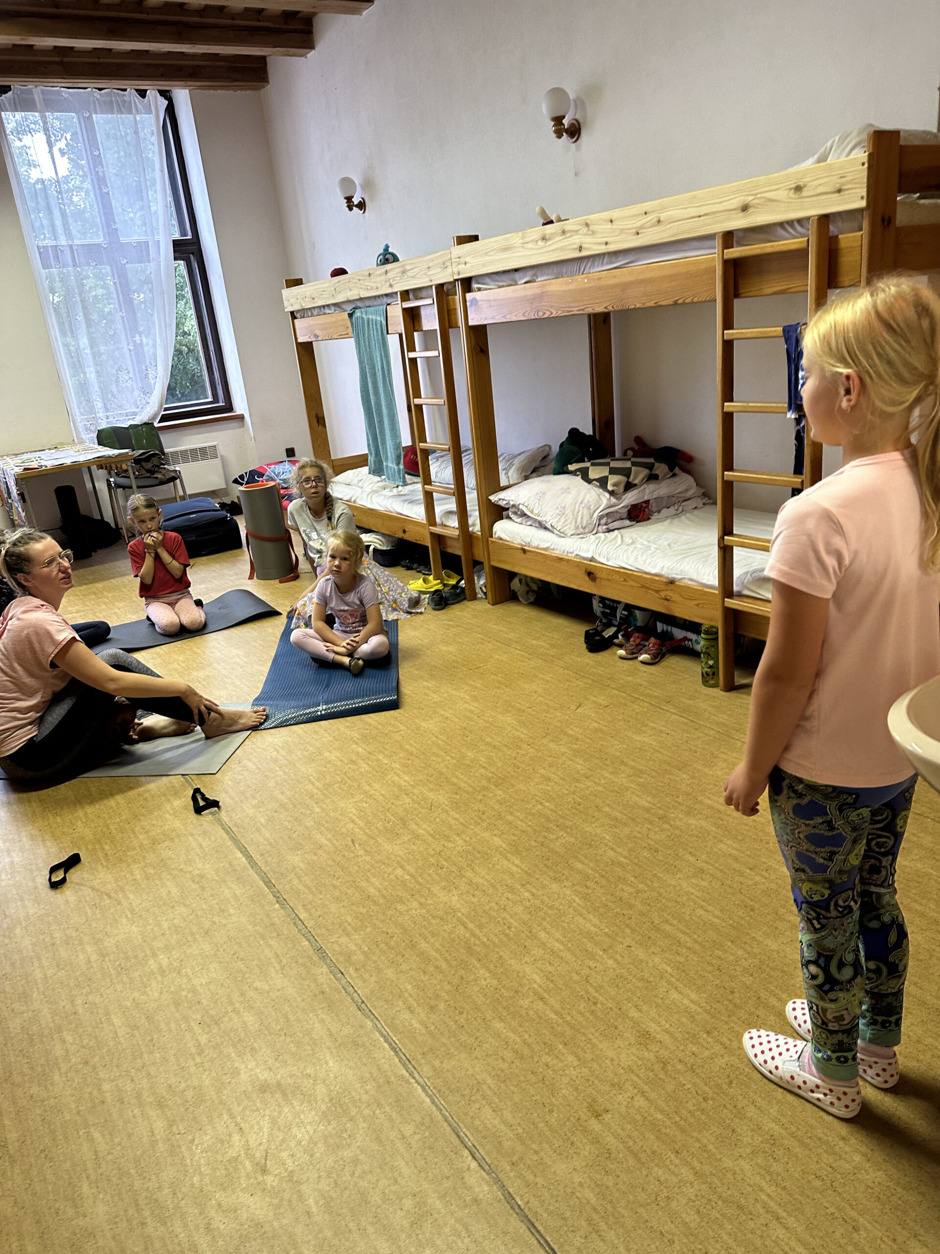 Vstávání do prvního pracovního dne nám sice dnes ráno nezpříjemnilo sluníčko, ale teplé počasí bylo příjemné. Rozcvičku pro první až třetí družstvo si vzali na starost Zbýša, Worši a Verča, čtvrté a páté družstvo po ránu protáhla LePra a pan Brtník, ke kterým se (i přes LePřino vzdorování) přicmrndli táborníci Ráďa a Vašek.
