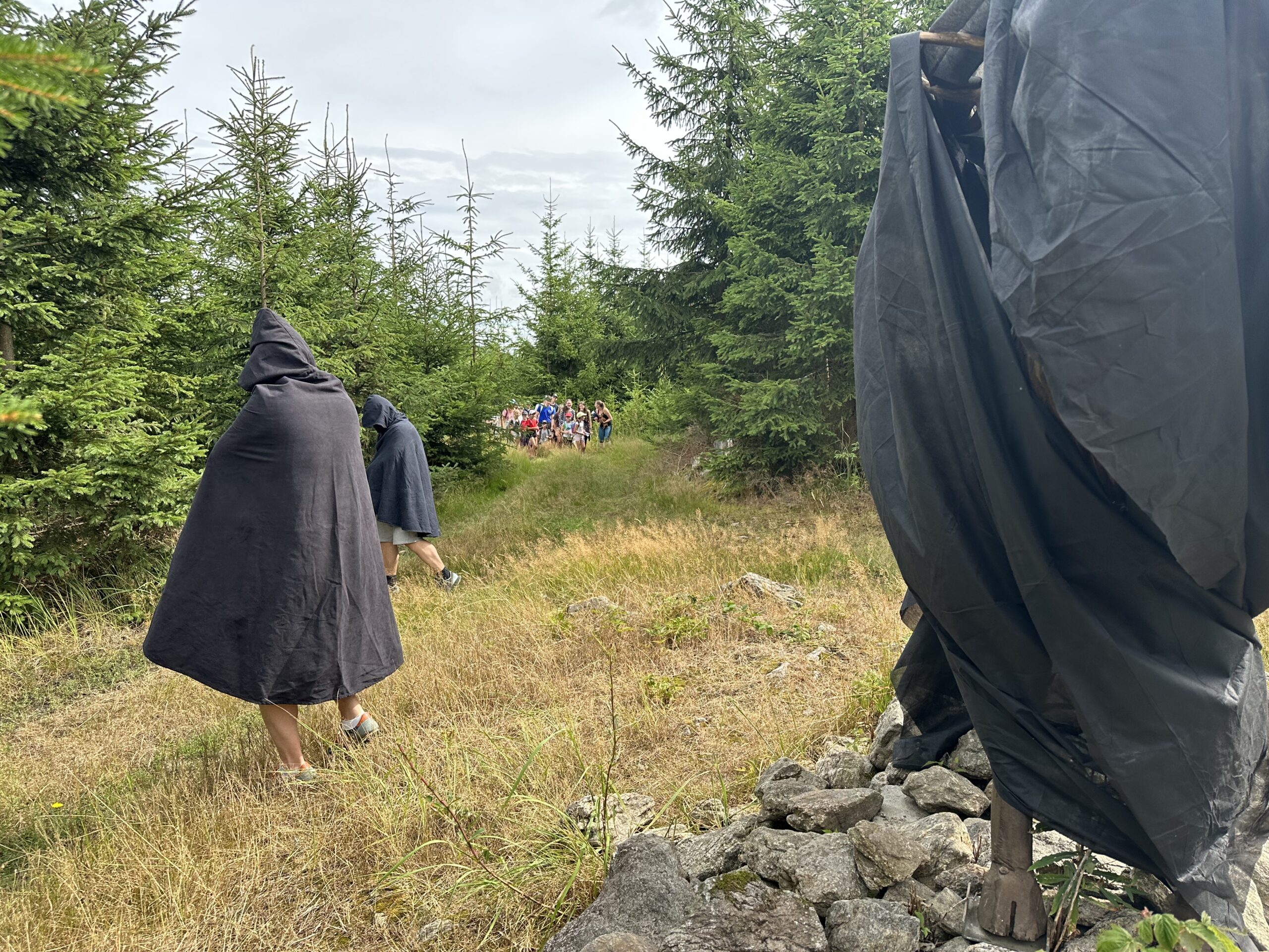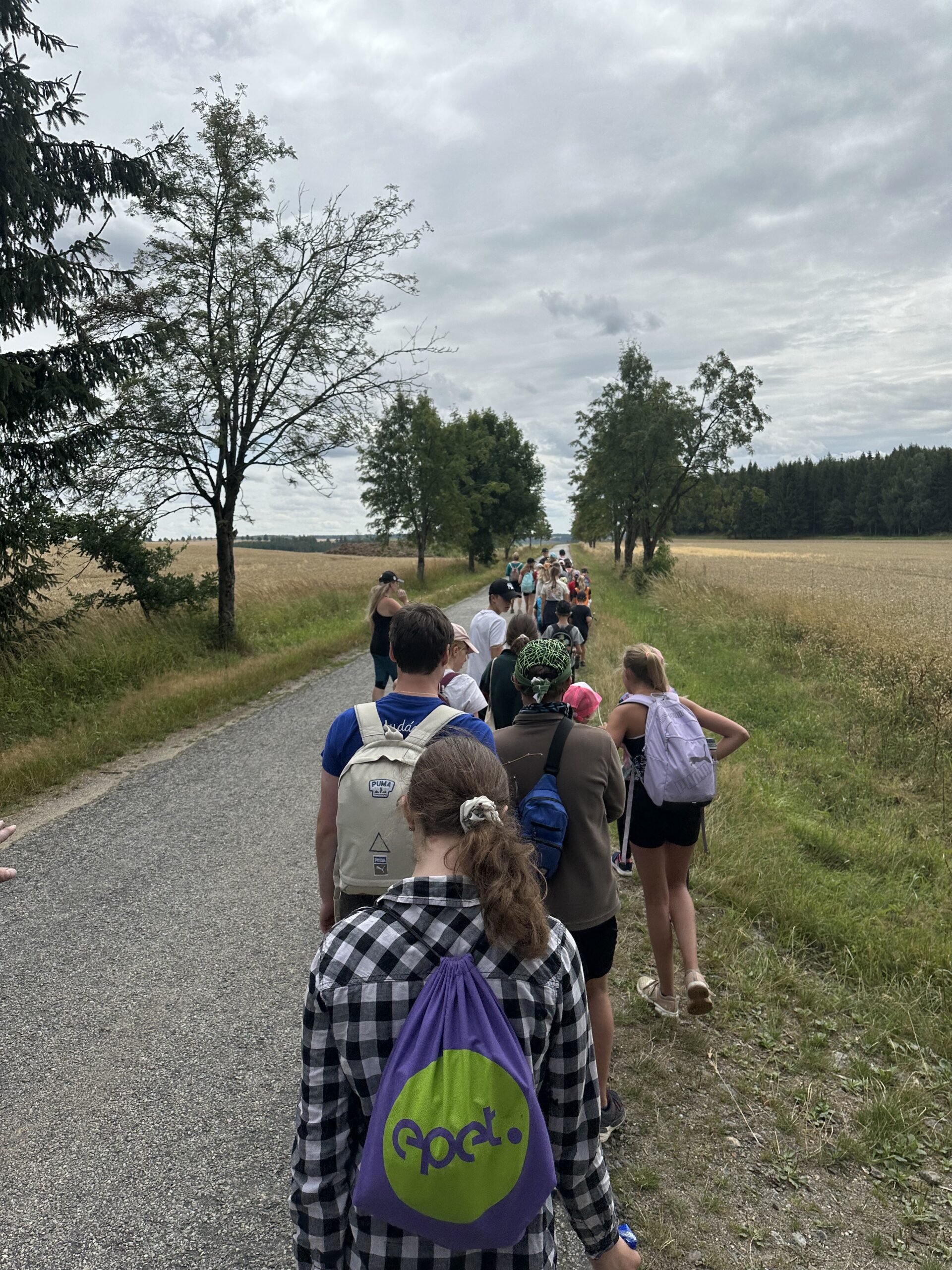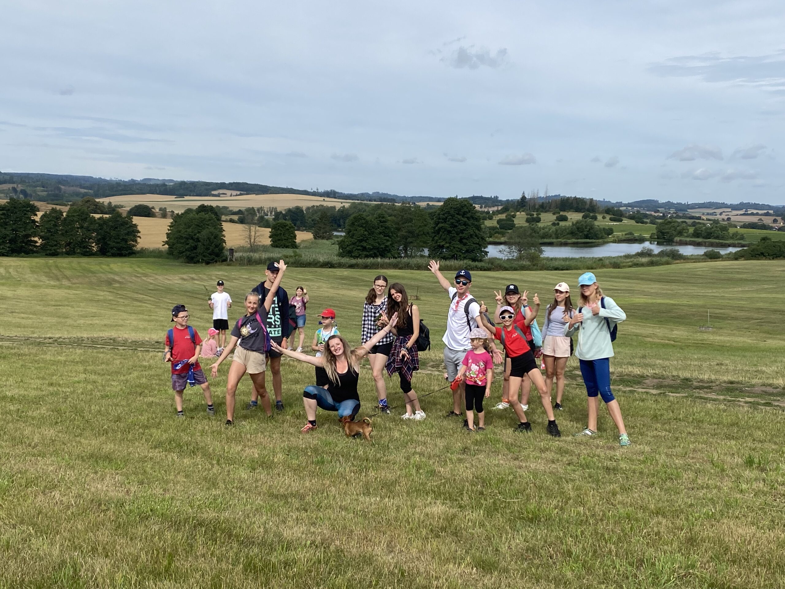 Po snídani jsme se šli převléknout a připravit na výlet. Protože po dlouhé době vysvitlo sluníčko, tak jsme se museli namazat opalovacím krémem, a ještě našplíchat repelentem, abychom byli připraveni na střet s divokou přírodou. Poté jsme vyrazili, ale asi po 100 metrech jsme se zastavili, protože jsme měli domluvenou zastávku v místním obchůdku. Dle slov našeho klíčníka a šafáře Stenlyho mohla paní prodavačka po našem náletu zavřít krám. Když jsme si dostatečně napakovali batůžky dobrůtkama, tak jsme si to konečně začali štrádovat do kopce po krásně vyfrézované silnici. Cesta nám hezky ubíhala. V čele našeho výletního štrúdlu byla Jula a LePra, které nám cestu zpříjemňovaly zpěvem a tancem. Druhý konec jistil Zbýša s Andulkou v nosítku a Verča. Stenly, Worši, Jarmilka a malý Theo v kočárku šli napřed, takže jsme vůbec nevěděli, kde jsou a jen jsme mohli doufat, že LePra skutečně tuší, kam nás vede. Po nějaké chvíli jsme odbočili na louku a prošli kolem rybníku. Cestou jsme měli za úkol nasbírat nějaké ingredience, abychom mohli vytvořit zotavovací lektvar. Potřebovali jsme nasbírat květ žluté barvy, květ kopřivy, list javoru, kořen smetánky lékařské a vodu z pramene.