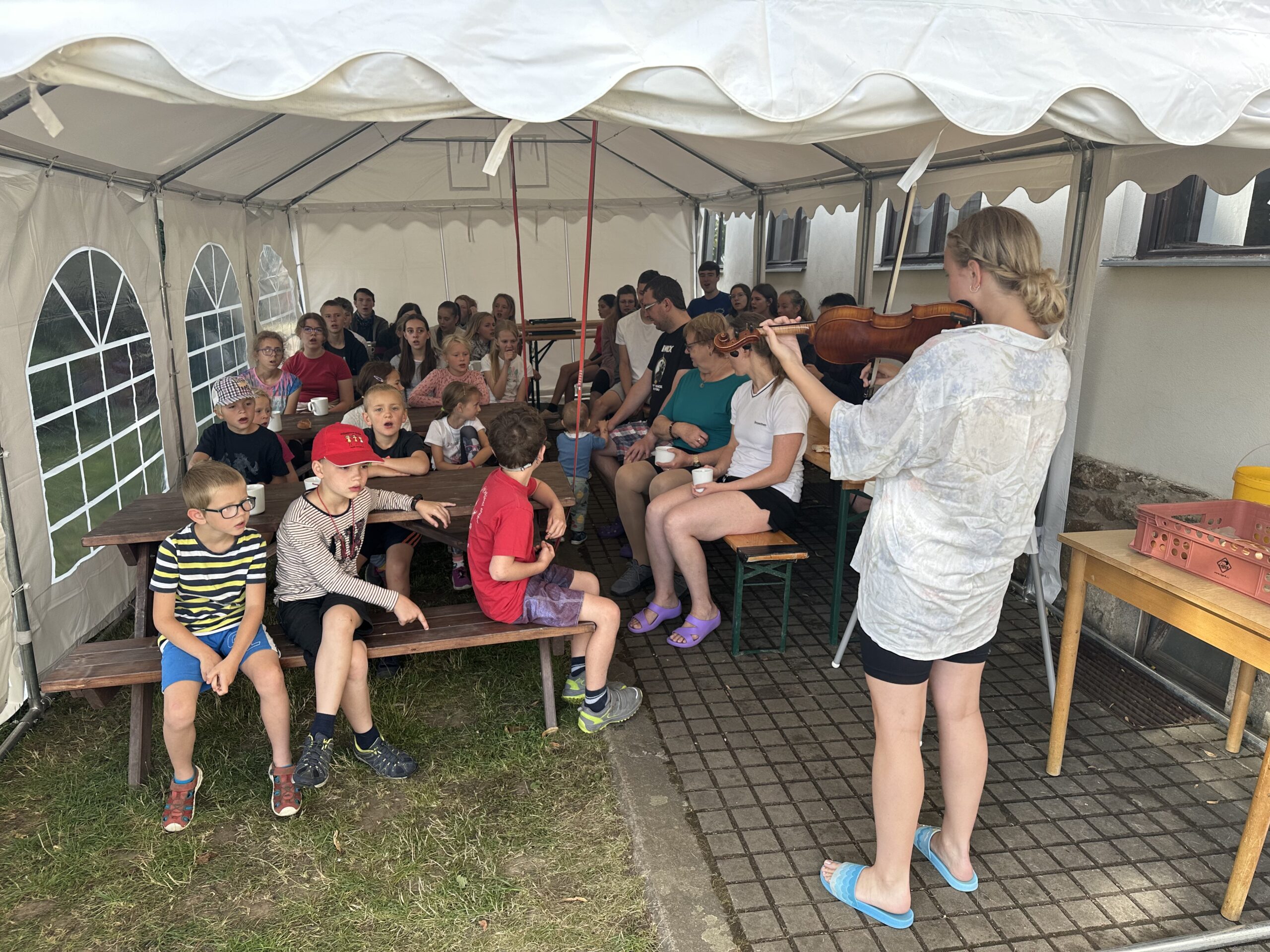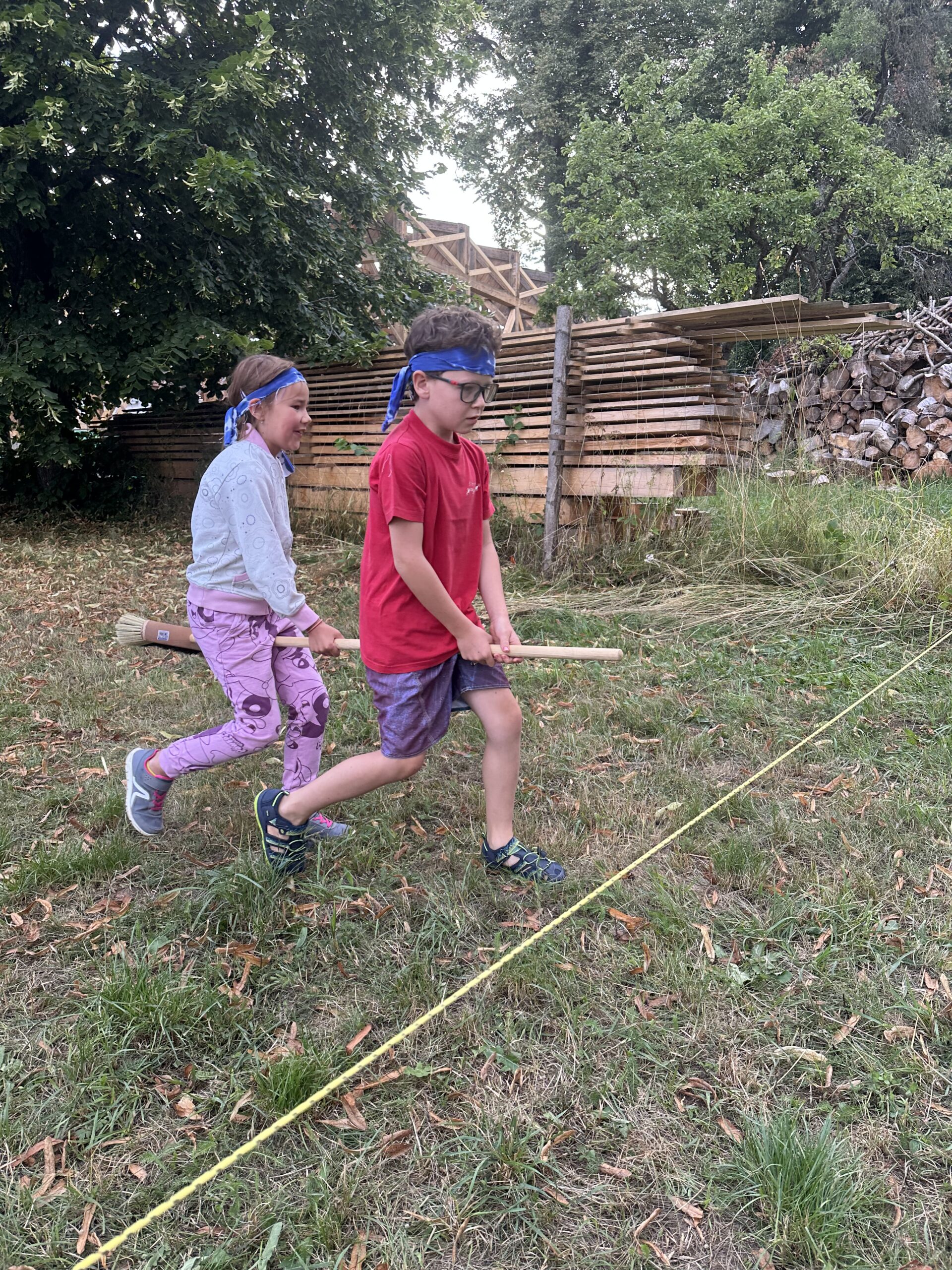 Po večeři nás ještě čekal nácvik letu na koštěti. Na zahradě jsme měli připravenou leteckou dráhu, kterou jsme museli jako tým zdolat. Na koštěti mohlo letět i několik osob najednou, ale nesměli sesednout od startu po cíl. Jelikož profesorka Graběnka Julová (čti „Žulová“ – francouzsky) stopovala čas, všichni si dali záležet, aby do cíle doletěli brzo. Naši malí kouzelníci ještě v kotlíku standartní velikosti 2 uvařili zotavovací lektvar z přinesených přísad a mohli se začít chystat do pelíšků.