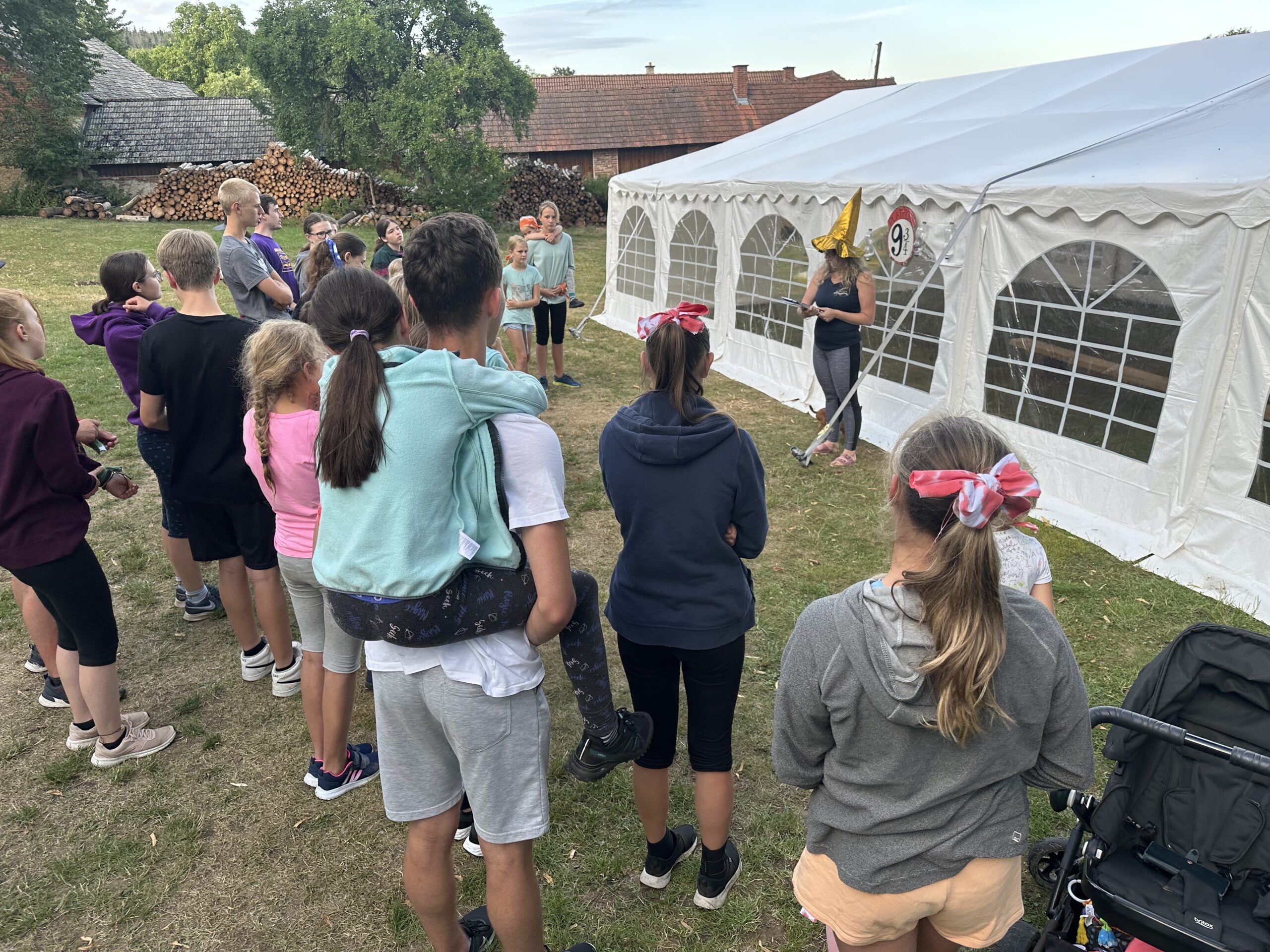 Už jsem se zmiňovala o denních písničkách? Již tradičně se při každém obědě učíme novou písničku, po večeři a snídani následujícího dne ji opakujeme. Letos už máme za sebou dvě. Tábor jsme započali jihlavskou vypalovačkou A v Jihlavě je pěknej dům, což je překrásný valčík z naší domoviny. Víme totiž, že nás čeká ještě nemálo dní a písnička bude čím dál ohranější. (pozn. redakce – není to chyba písně, ale opakovaní valčíku o čtyřech slokách třikrát denně může mít silný vliv na nervový pohár, ovšem se statečně držíme a stále zpíváme s úsměvem na tváři.) Naštěstí dnes byla vybraná o něco živější píseň Šla Marjánka ke hrobu. Ta pomalu, ale skoro jistě roztančila celý jídelní stan a dodala potřebnou energii na hru, která následovala po večeři.